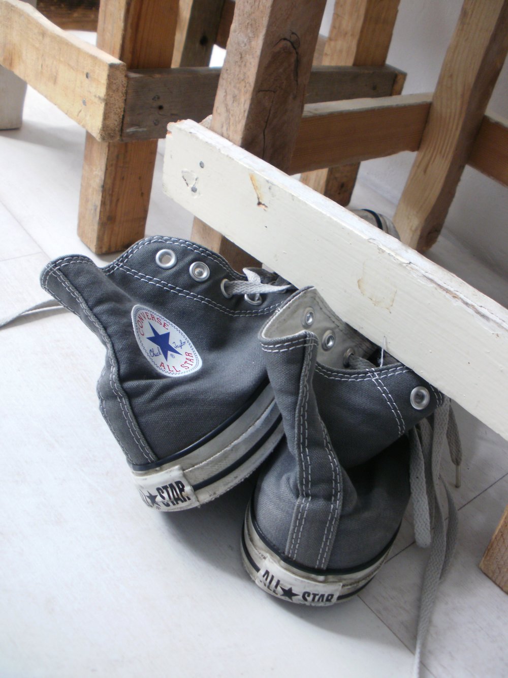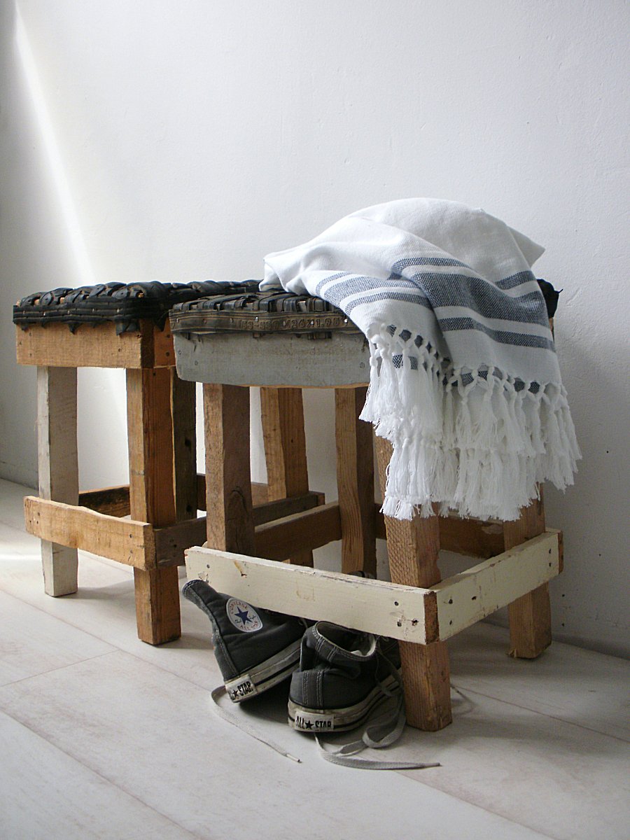A sunny scene.... benches made out of recycled wood and tyres, beautiful Hammam towels in white and grey and some old All stars to walk along the beach with..... I feel so at home in this tough beachy kind of atmosphere