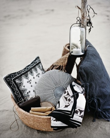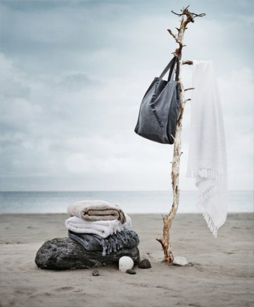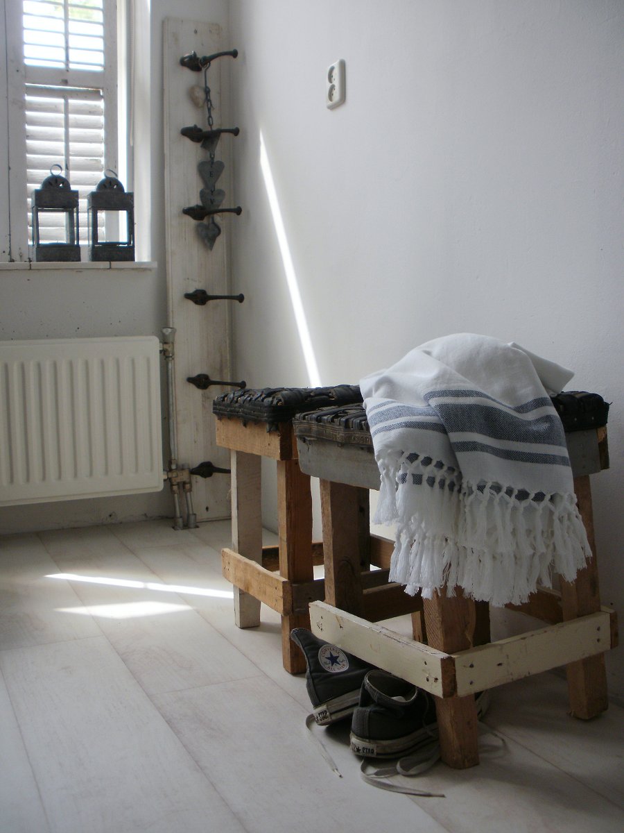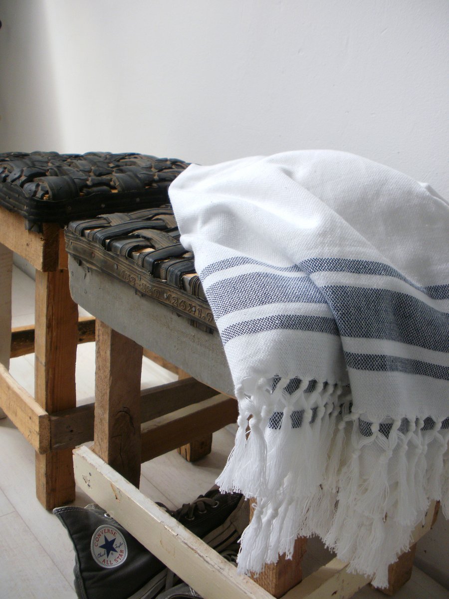 A sunny scene.... benches made out of recycled wood and tyres, beautiful Hammam towels in white and grey and some old All stars to walk along the beach with..... I feel so at home in this tough beachy kind of atmosphere