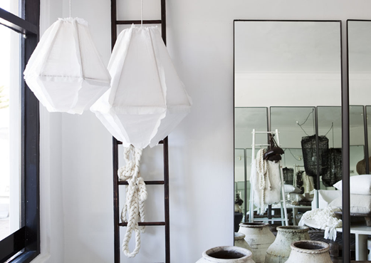I found these pictures through the site of Est Magazine and I really love the black dramatic elements such as the huge lamps in this white interior with organic and natural elements. Est is giving a sneak peek into the new installation at Les Interieurs Pamela Makins design studio and concept store.